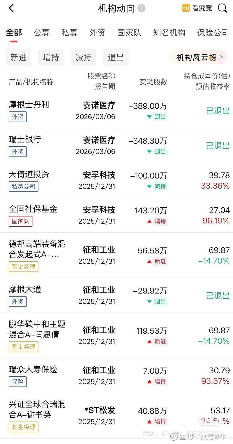 家人们!今天刷机构动向直接看傻了👀摩根士丹利+瑞士银行,两大顶级外资巨头,居然在同一天彻底清仓了赛诺医疗!1.摩根士丹利:减持389万股,直接退出2.瑞士银行:减持348.3万股,同样清仓离场这可不是小打小闹的减仓,是不留一股的彻底跑路!