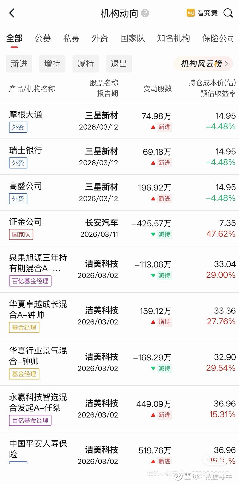 顶级外资摩根大通、瑞士银行、高盛公司于2026年3月12日同步新进三星新材,合计买入超440万股,持仓成本均为14.95元,布局逻辑清晰聚焦低温绝热与光伏玻璃两大核心赛道。