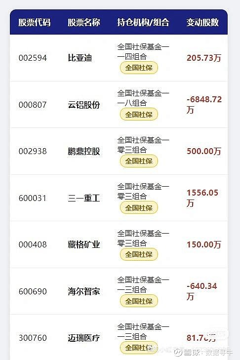 ✅ 加仓方向:两大主线被重点押注1. 高端制造+新能源龙头三一重工被社保一零三组合狂加仓1556.05万股,比亚迪也获一一四组合加仓205.73万股,鹏鼎控股、藏格矿业同样获得超百万股加仓。逻辑很简单:制造业复苏预期+新能源赛道长期价值,社保在坚定布局核心龙头的成长红利!2. 医疗+消费白马迈瑞医疗获社保一一三组合加仓81.78万股,作为医疗器械龙头,业绩稳健+估值合理,妥妥的长期价值标的。