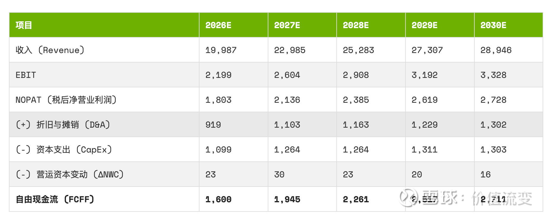 基于以上假设,我们预测公司在2026年至2030年的自由现金流(FCFF)如下表所示: