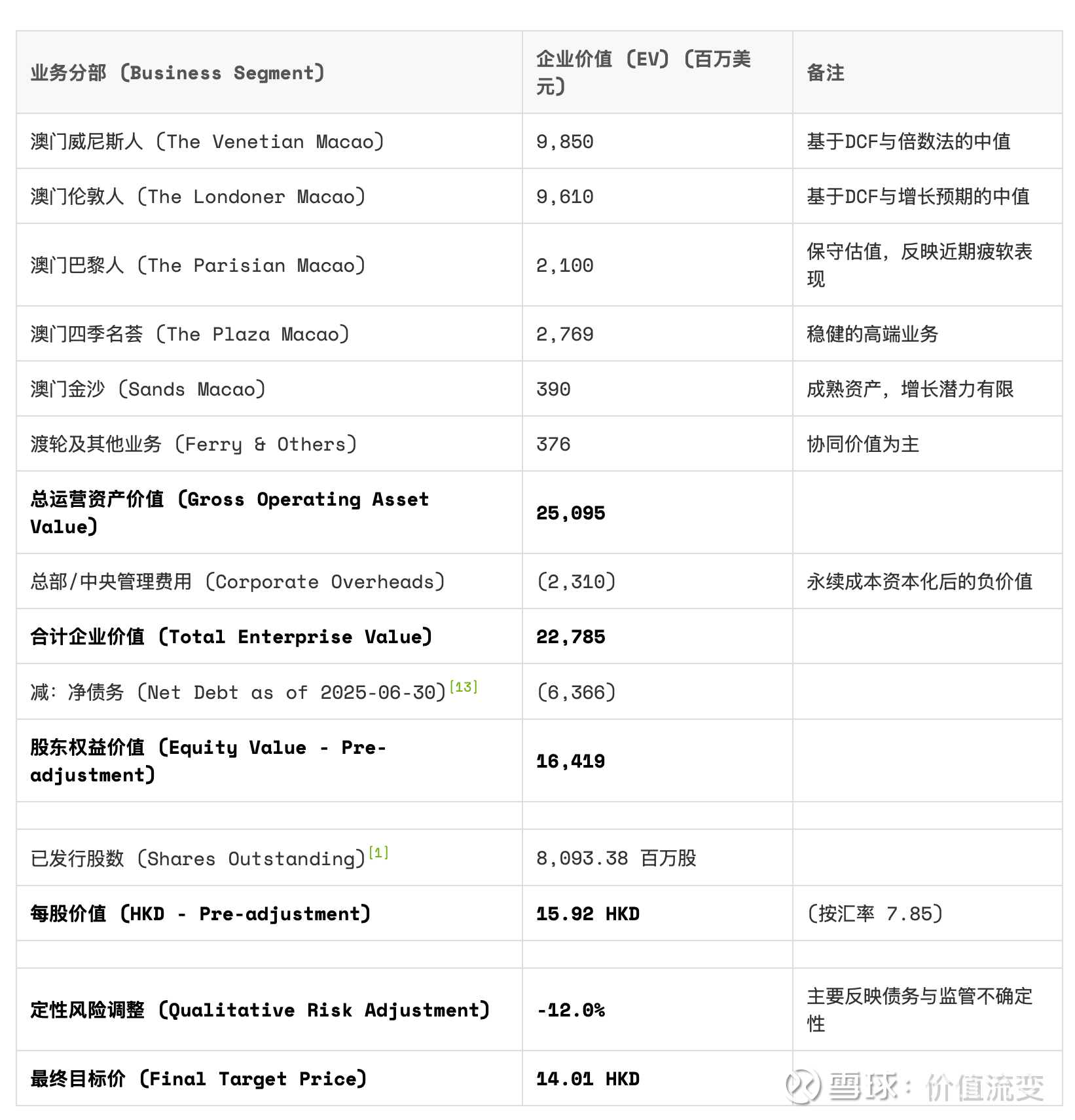 结论: 综合两种方法,我们评估澳门威尼斯人的企业价值(EV)中值为98.5亿美元。