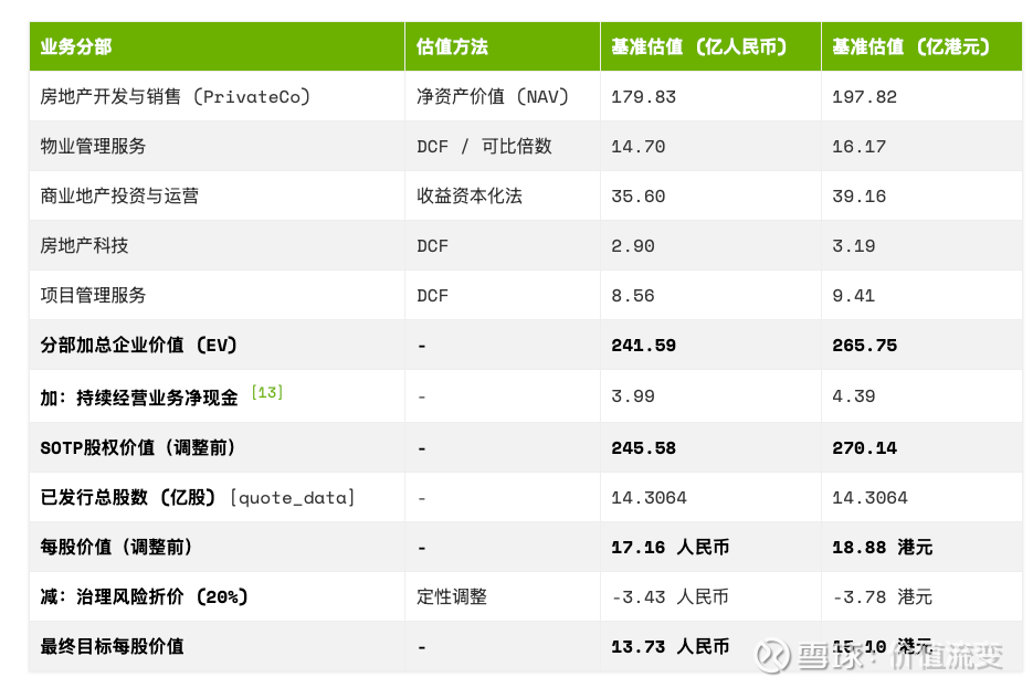 SOTP方法允许我们对每一个业务板块——从已剥离但价值尚存的开发业务,到持续经营的四大服务板块——使用最适合其特性的估值工具进行独立评估。这不仅能更清晰地揭示各部分对公司整体价值的贡献,还能有效隔离不同业务的特定风险,并识别出价值被掩盖或低估的环节。我们的分析将逐一解构这五个部分,最终拼凑出“新美的置业”的完整价值版图。