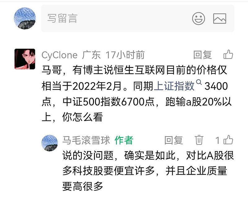 港股近期被diss,我场外支付宝坚持定投恒生ETF。另外恒生科技、恒生互联网也被diss,昨天有人留言提问:马哥,有博主说恒生互联网目前的价格仅相当于2022年2月。同期上证指数3400点,中证500指数6700点,跑输a股20%以上,你怎么看?我的看法:说的没问题,确实是如此,对比A股很多科技股要便宜许多,并且企业质量要高很多。