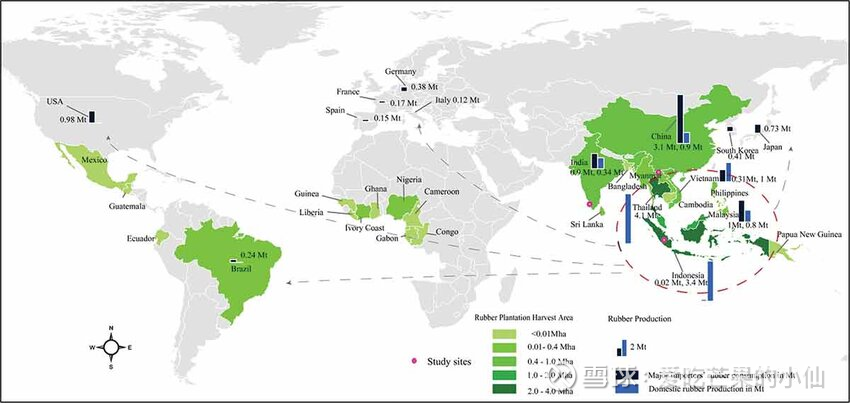 从全球生产格局来看,天然橡胶的供应具有高度集中的特征。根据IRSG和ANRPC的统计,目前全球天然橡胶年产量大约在1500万吨左右,其中绝大部分来自东南亚地区。泰国、印度尼西亚、越南、中国和马来西亚是最主要的生产国,其中泰国和印尼长期位居前两位,两国合计产量接近全球总量的60%。如果再加上柬埔寨、老挝和缅甸等新兴产区,可以说全球85%以上的天然橡胶供应都集中在东南亚。近年来非洲科特迪瓦也异军突起。