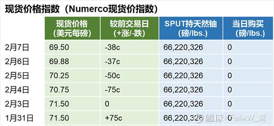 虽然上周特朗普决定暂停30天对加拿大进口商品征收25%的关税,本周天然铀现货价格没有得到提振,市场表现低迷,现货价一直处于阴跌态势,2月6日现货价再次跌破70美元每磅。