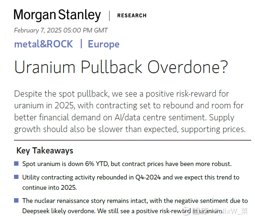 大摩商品团队2月7日发布报告表示,虽然天然铀现货价在2025年下跌了6%,但长贸价格表现强劲。核电业主的长贸签订活跃度在2024年第四季度出现反弹,预计这一趋势将在2025年持续下去。大摩表示,核能复兴的故事仍然完好无损,市场对Deepseek的过度反应是导致近期天然铀表现低迷的主要原因。大摩认为天然铀的供需基本面对铀价有支撑效果,天然铀的风险回报是积极的(positive risk-reward)。