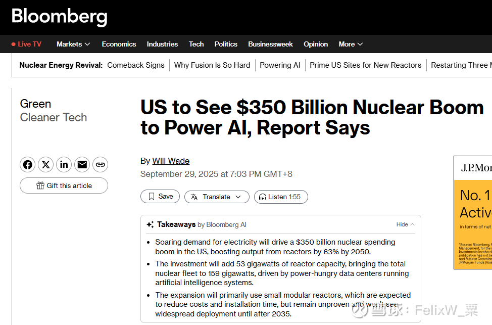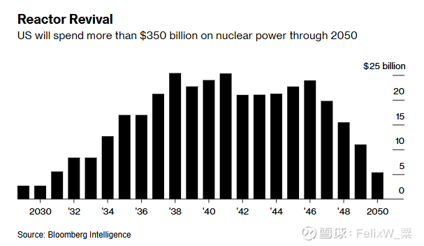 彭博资讯报道,飙升的电力需求将推动美国3500亿美元的核能支出热潮,到2050年,反应堆的产量将提高63%。该研究公司在周一的一份报告中说,关键驱动因素是运行人工智能系统的耗电数据中心,这笔投资将增加53吉瓦的反应堆容量,使总核电容量达到159吉瓦。