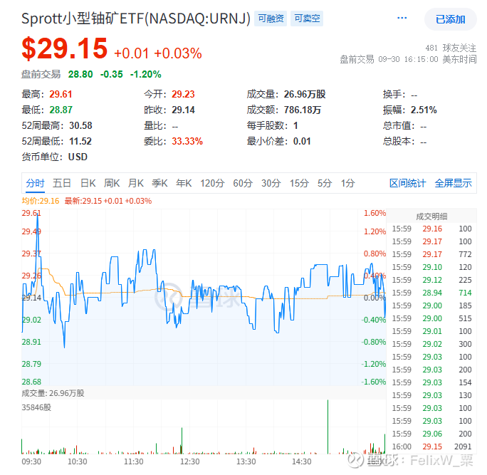 天然铀公司股价指数参考:(+0.03%)Sprott小型铀矿ETF(NASDAQ:URNJ)