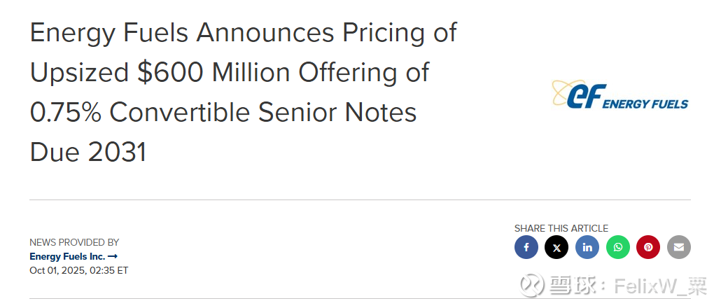 DENVER, Oct. 1, 2025 /PRNewswire/ - Energy Fuels Inc. ("Energy Fuels") (NYSE: UUUU) (TSX: EFR), a leading U.S. producer of uranium, rare earths, and critical minerals, today announced the pricing of $600 million aggregate principal amount of 0.75% Convertible Senior Notes due 2031 (the "notes") in a private placement (the "offering") to persons reasonably believed to be qualified institutional buyers pursuant to Rule 144A under the Securities Act of 1933, as amended (the "Securities Act"). The size of the offering was increased from the previously announced $550.0 million aggregate principal amount of notes.