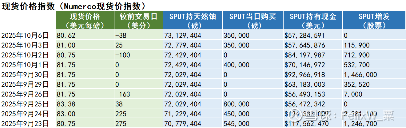 10月06日,星期一,天然铀现货价跌38美分,收80.62美元每磅,全球天然铀股票指数URNJ涨1.89%。