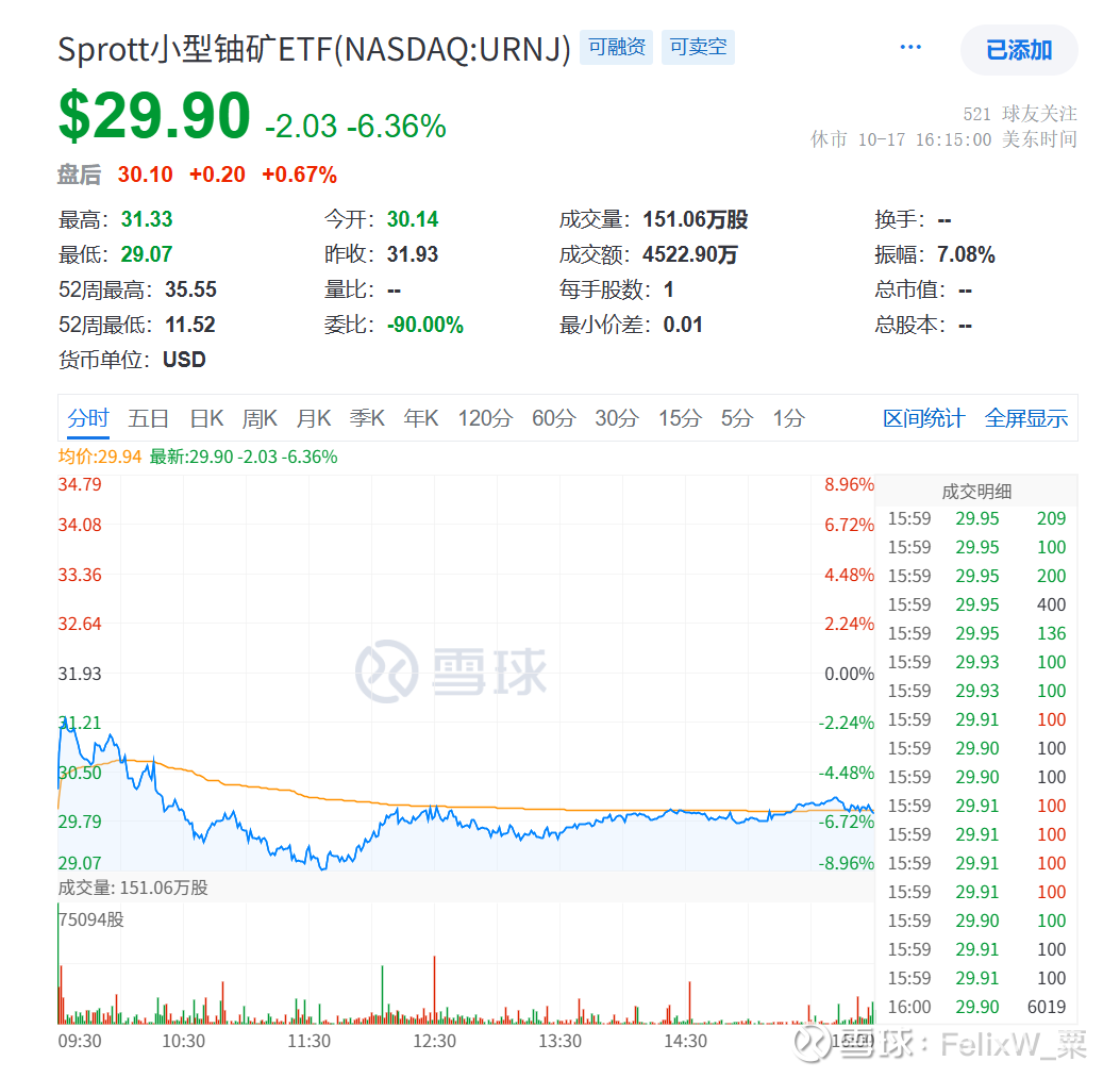 天然铀公司股价指数参考:(-6.36%)Sprott小型铀矿ETF(NASDAQ:URNJ)