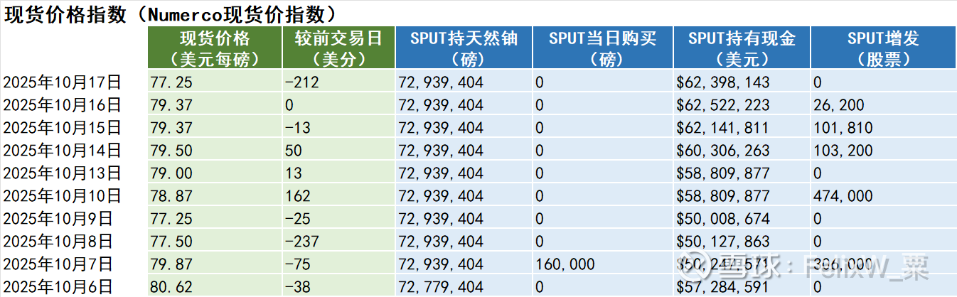 10月17日,星期五,天然铀现货价跌212美分,收77.25美元每磅,全球天然铀股票指数URNJ跌6.36%。