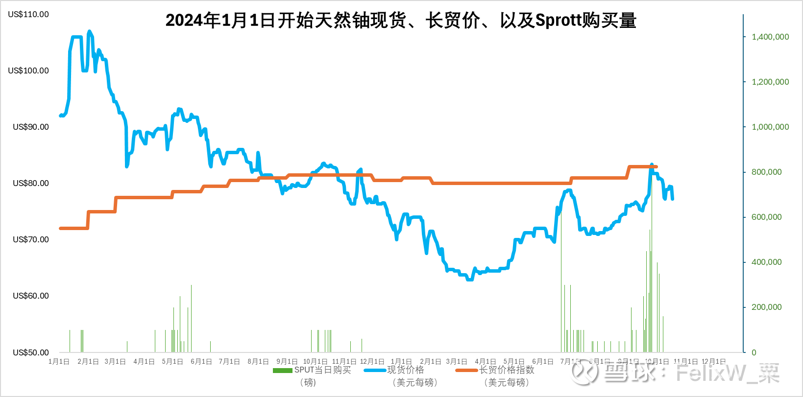 天然铀现货与长贸价格指数 :(-212美分)(附:Sprott Physical Uranium Trust铀持仓)