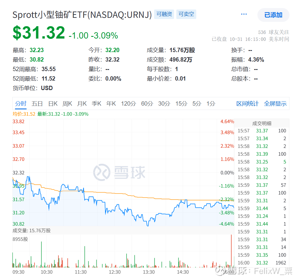 天然铀公司股价指数参考:(-3.09%)Sprott小型铀矿ETF(NASDAQ:URNJ)