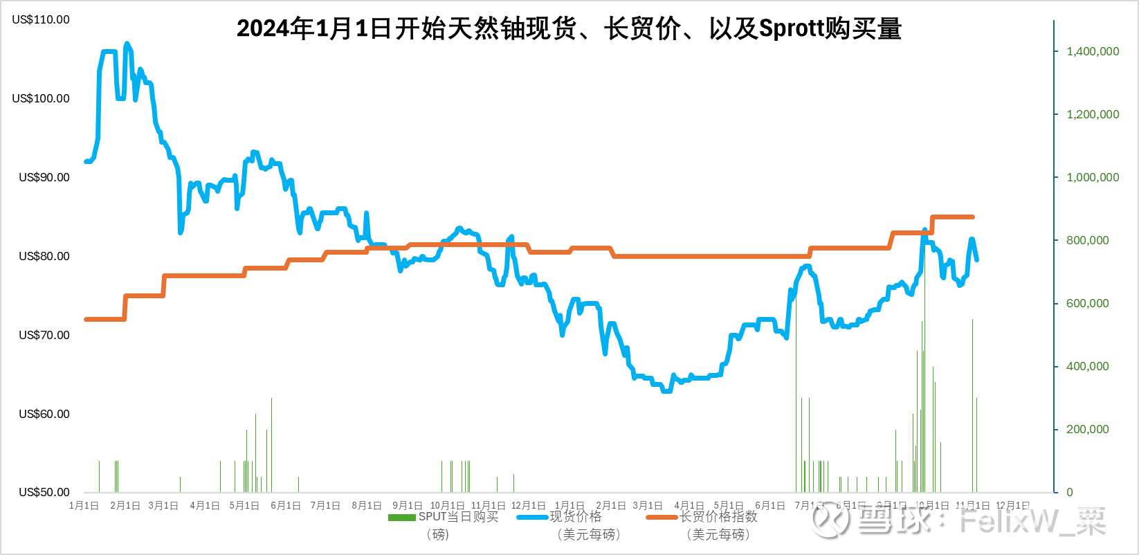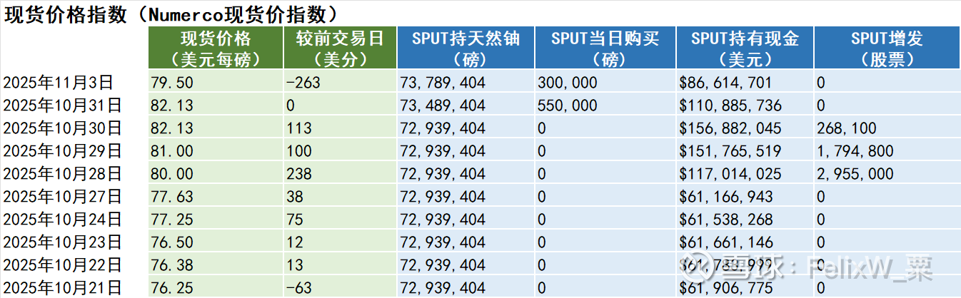 11月3日,星期一,天然铀现货价跌263美分,收79.50美元每磅,10月长贸价格85美元每磅,较9月份上涨2美元。全球天然铀股票指数URNJ跌8.24%。