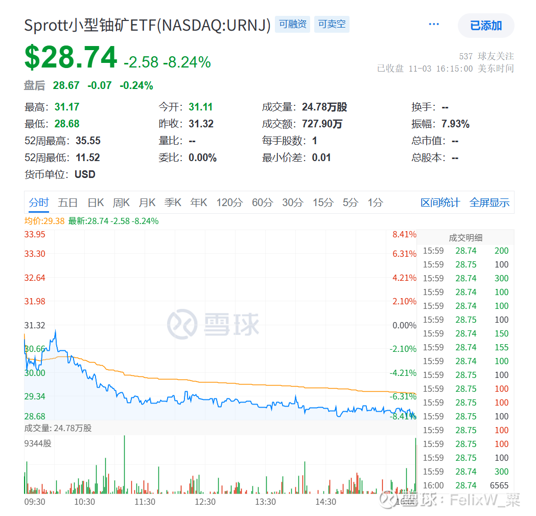 天然铀公司股价指数参考:(-8.24%)Sprott小型铀矿ETF(NASDAQ:URNJ)