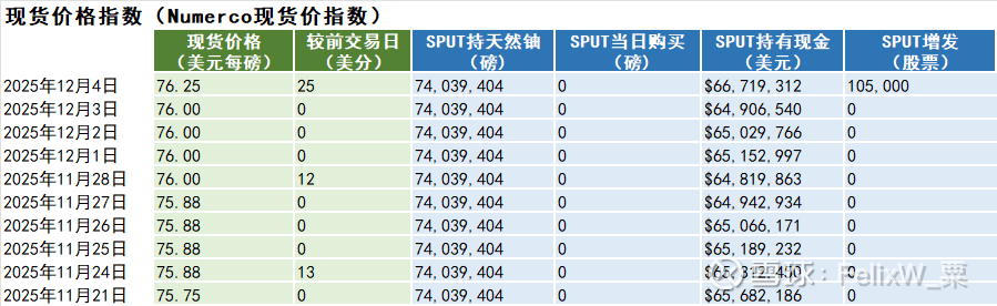 天然铀现货与长贸价格指数 :(+25美分)(附:Sprott Physical Uranium Trust铀持仓)