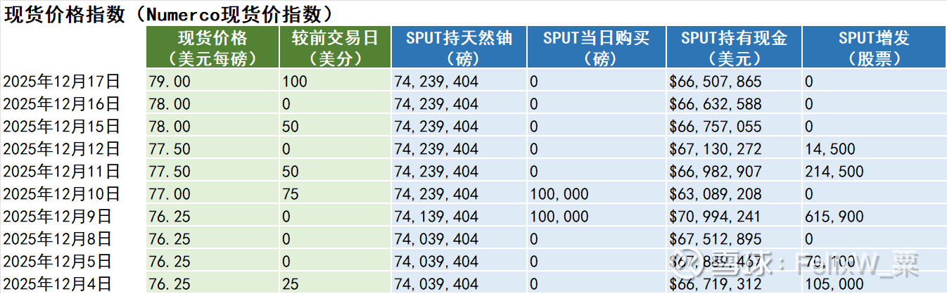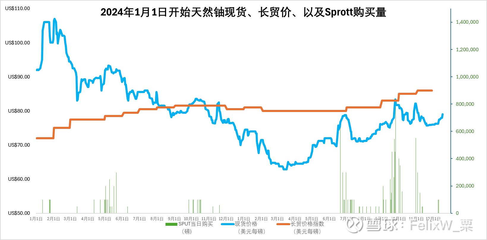 天然铀现货与长贸价格指数 :(+100美分)(附:Sprott Physical Uranium Trust铀持仓)