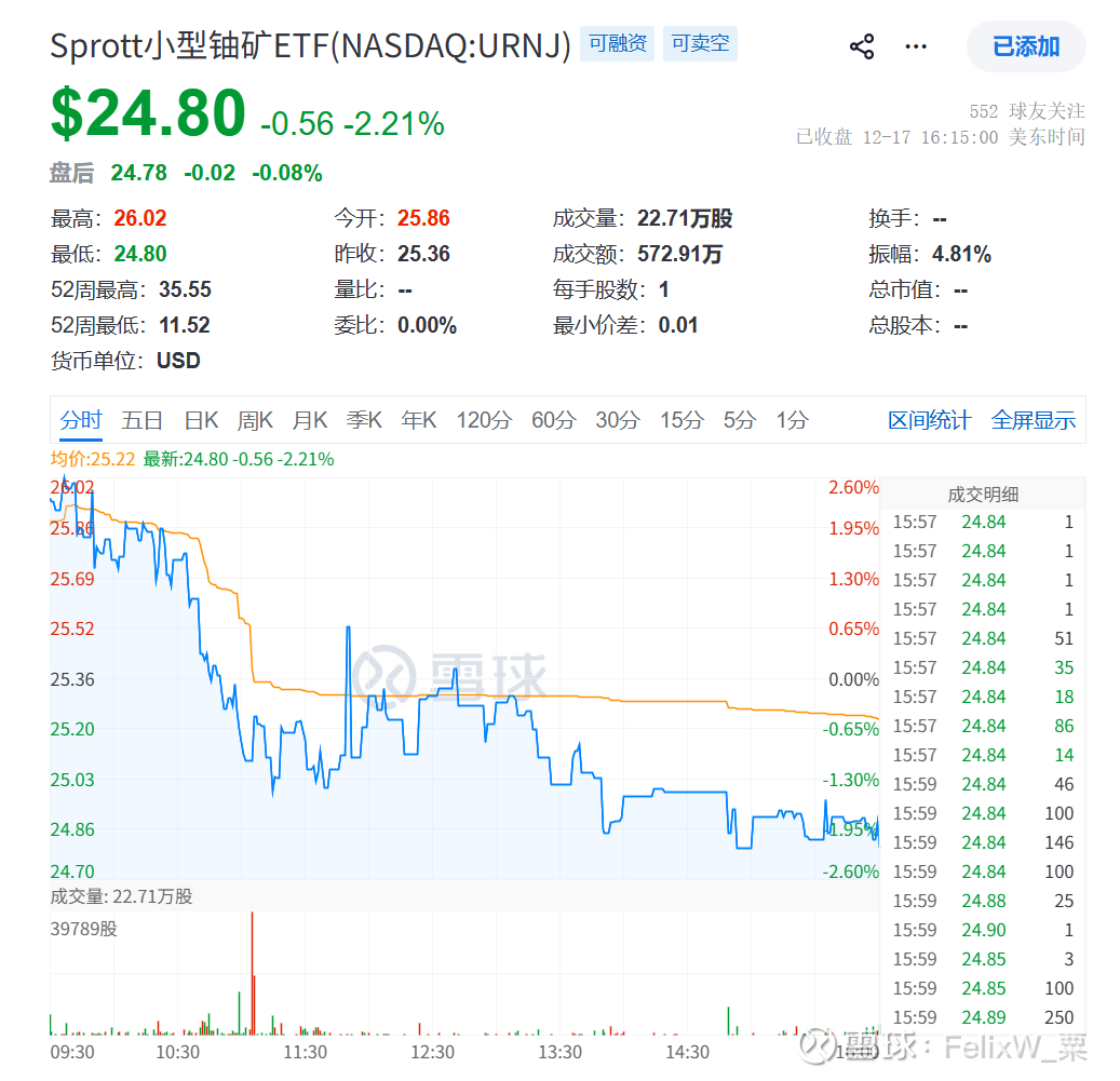 天然铀公司股价指数参考:(-2.21%)Sprott小型铀矿ETF(NASDAQ:URNJ)