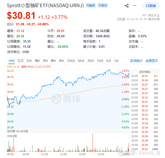 天然铀公司股价指数参考:(+3.77%)Sprott小型铀矿ETF(NASDAQ:URNJ)