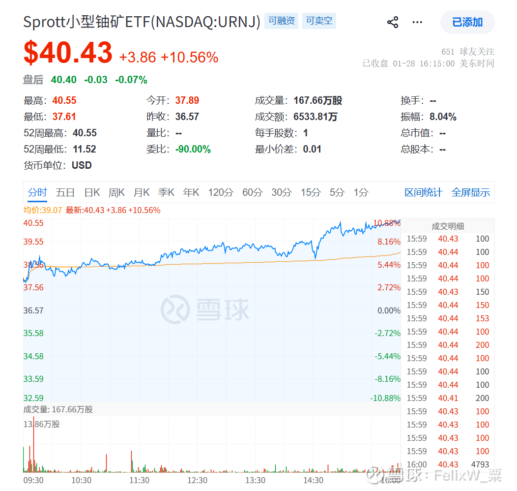 天然铀公司股价指数参考:(+10.56%)Sprott小型铀矿ETF(NASDAQ:URNJ)