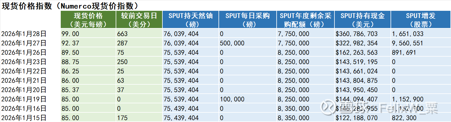 1月28日,星期三,天然铀现货价涨663美分,收99.00美元每磅。全球天然铀股票指数URNJ涨10.56%。