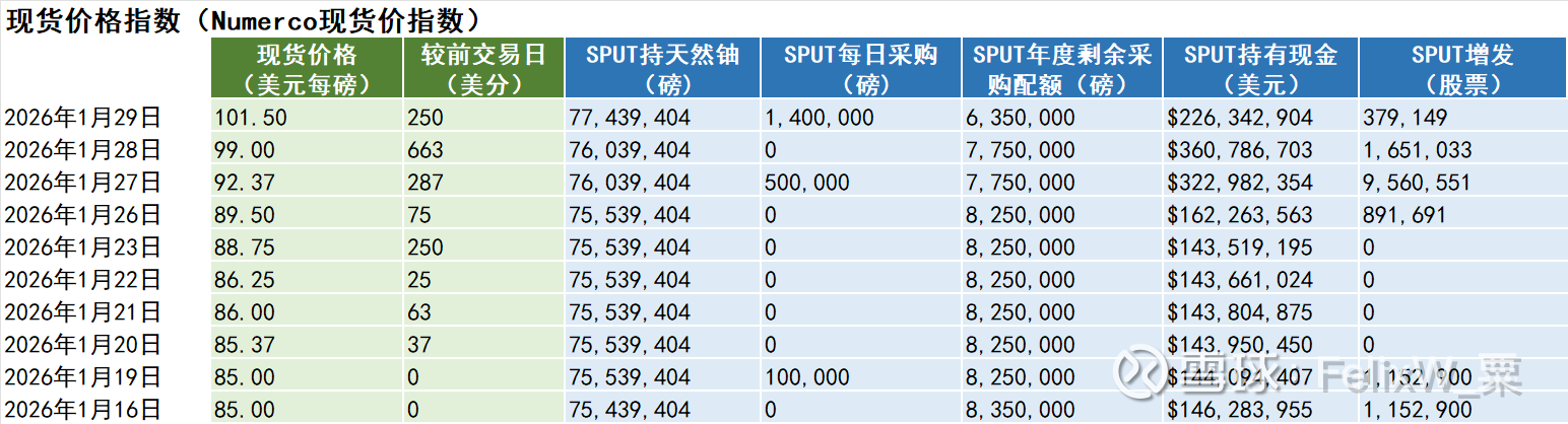 1月29日,星期四,天然铀现货价涨250美分,收101.50美元每磅。全球天然铀股票指数URNJ跌4.40%。