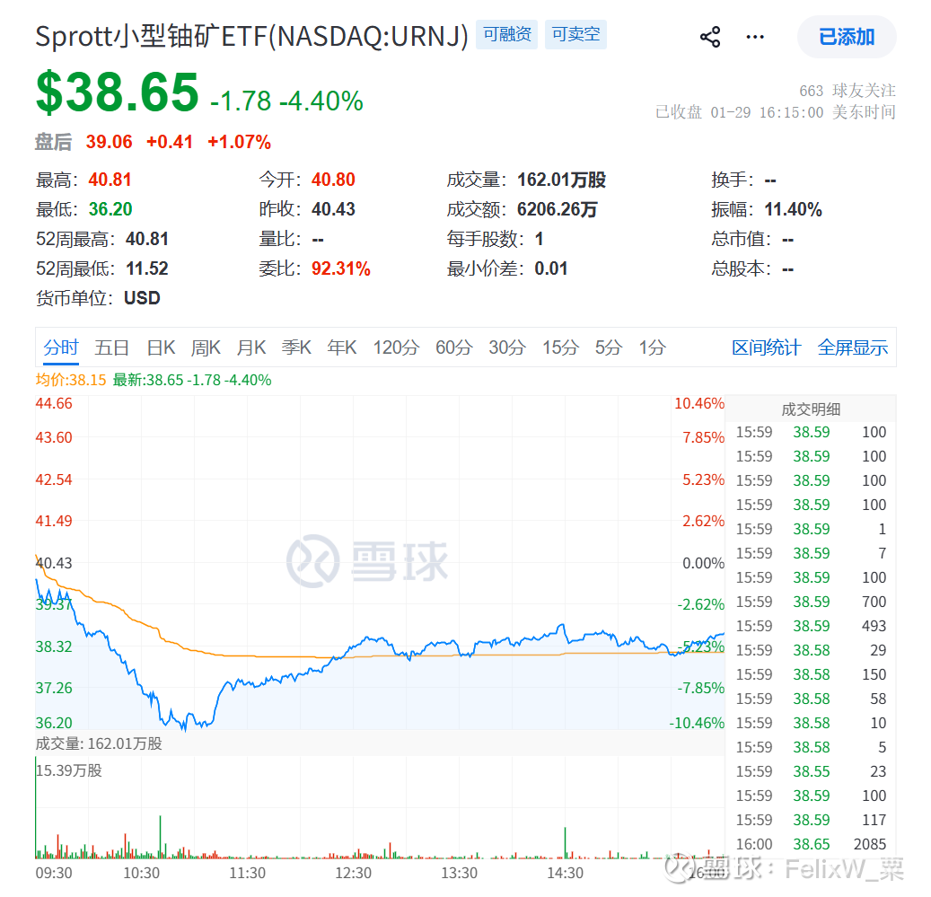 天然铀公司股价指数参考:(-4.40%)Sprott小型铀矿ETF(NASDAQ:URNJ)