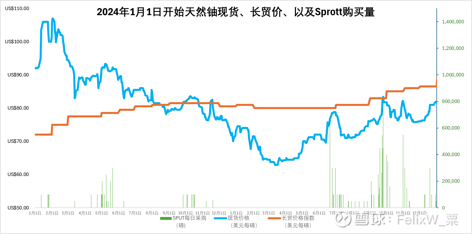 天然铀现货与长贸价格指数 :(-500美分)(附:Sprott Physical Uranium Trust铀持仓)