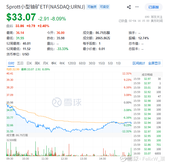 2月4日,星期三,天然铀现货价跌500美分,收86.00美元每磅。全球天然铀股票指数URNJ跌8.09%。