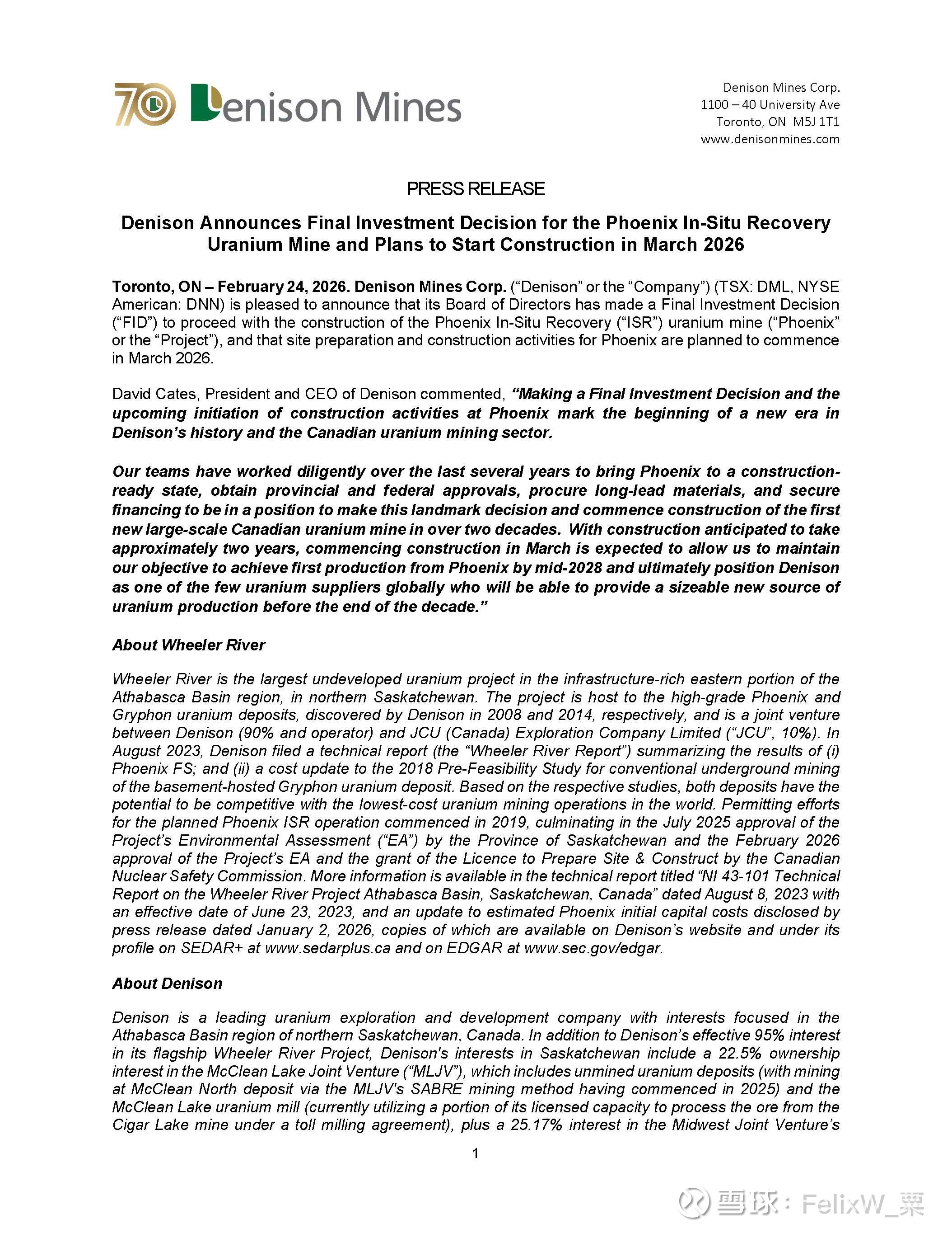 Denison Mines Corp. (TSX: DML, NYSE American: DNN) 宣布,其董事会已就位于萨斯喀彻温省北部阿萨巴斯卡盆地的菲尼克斯(Phoenix)就地回收(ISR)铀矿项目做出最终投资决定(FID)。现场准备和建设工作计划于2026年3月开始。