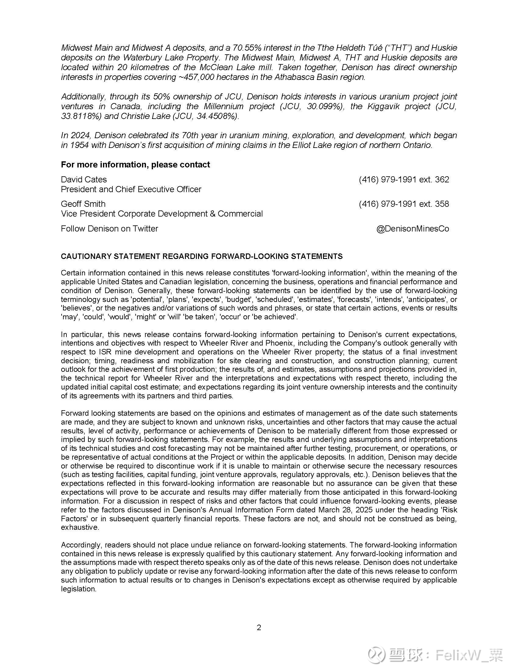项目地位: 菲尼克斯是Wheeler River项目的一部分,这是该地区最大的未开发铀矿项目。Denison拥有该项目90%的权益并担任运营商。