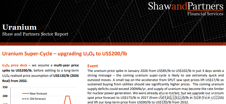 继Canaccord Genuity和瑞银分别将天然铀价格预期上调至110美元/磅和100美元/磅之后,Shaw and Partners也提高了其对天然铀价格的预测。Shaw在其最新的铀行业报告中指出,天然铀价格在2026年1月份三天内从85美元/磅飙升至102美元/磅,凸显了当前铀周期的波动性和潜在规模。Shaw and Partners已将2027年铀价预测从每磅150美元上调至每磅175美元,并将2028年铀价预测从每磅150美元上调至每磅200美元。长贸价格的预测也从之前的每磅90美元上调至2032年的每磅120美元。Shaw and Partners认为,结构性供应缺口可能超过每年2亿磅,铀供应将成为全球核电扩张的制约因素。