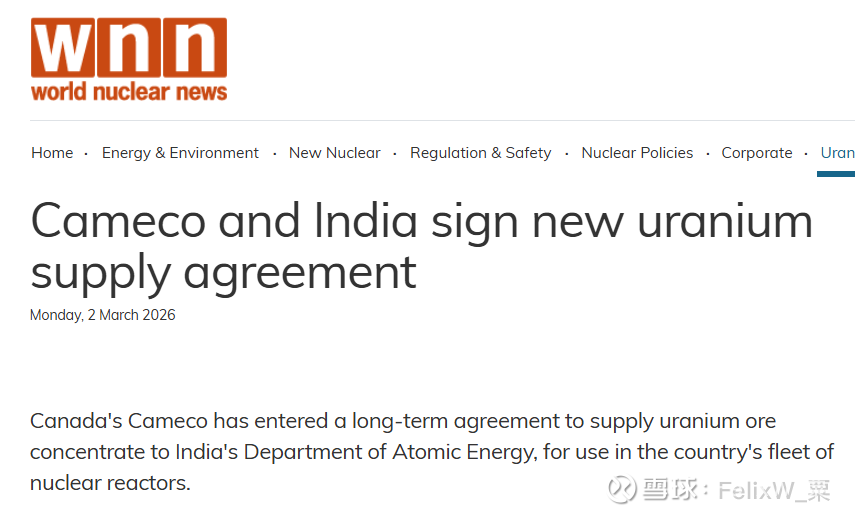 印度与加拿大签署天然铀长贸供应合同,27年至35年间供应2200万磅(8462吨铀)天然铀,具体执行价格将依据届时实际市场情况,合同总金额预计将为19亿美元,26亿加元。