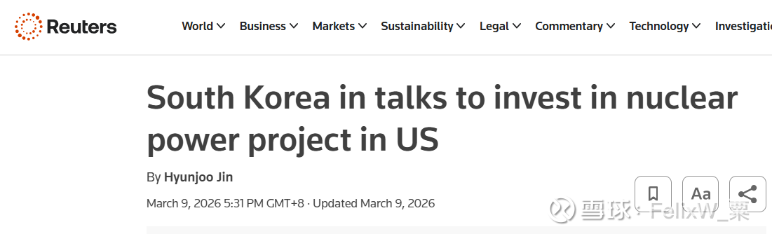 SEOUL, March 9 (Reuters) - South Korea's Industry Minister Kim Jung-kwan said on Monday that Seoul is in talks to invest in a nuclear power project in the United States as part of Seoul's pledge to invest a total of $350 billion in U.S. projects.