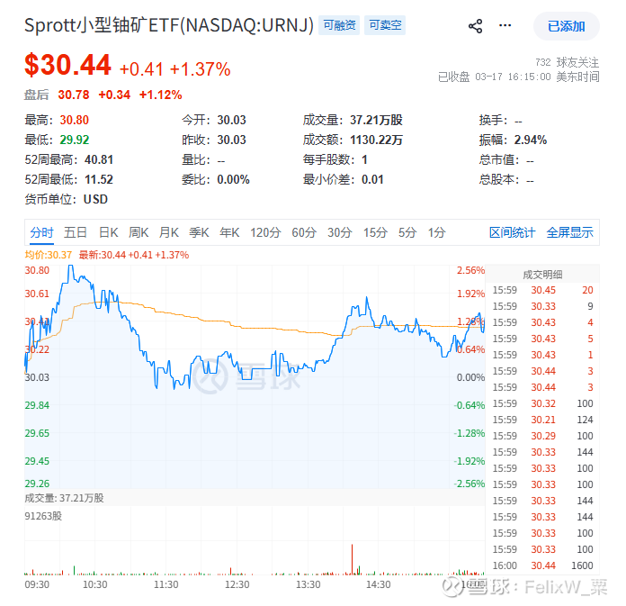 天然铀公司股价指数参考:(+1.37%)Sprott小型铀矿ETF(NASDAQ:URNJ)