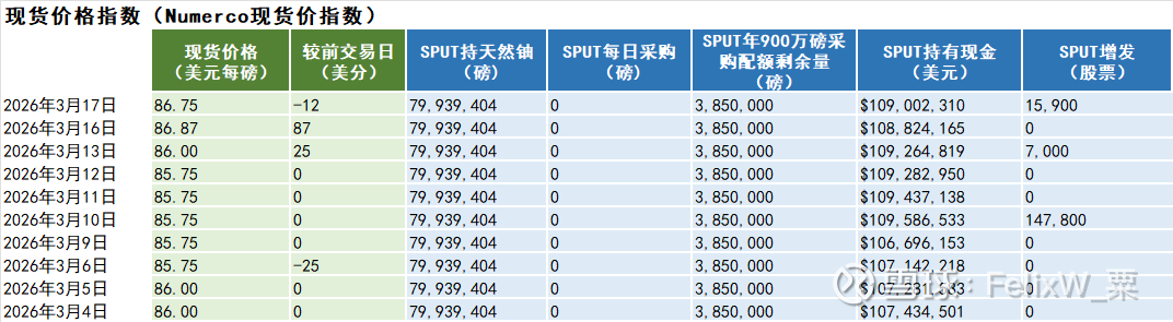 3月17日,星期二,天然铀现货价跌12美分,收86.75美元每磅。全球天然铀股票指数URNJ涨1.37%。