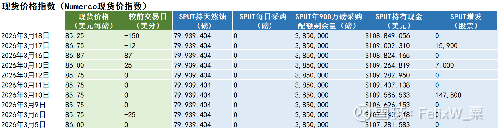 3月18日,星期三,天然铀现货价跌150美分,收85.25美元每磅。全球天然铀股票指数URNJ跌4.04%。