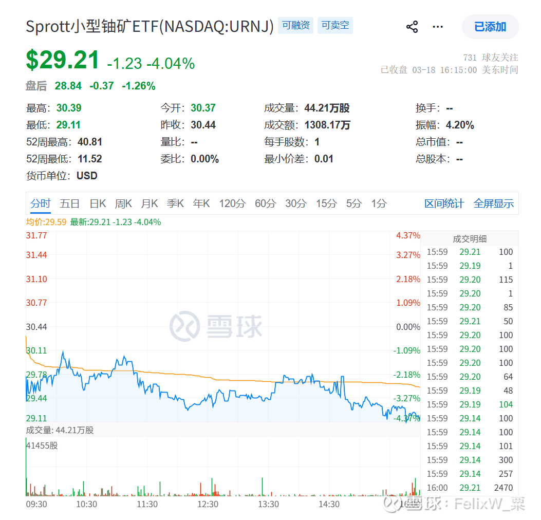 天然铀公司股价指数参考:(-4.04%)Sprott小型铀矿ETF(NASDAQ:URNJ)