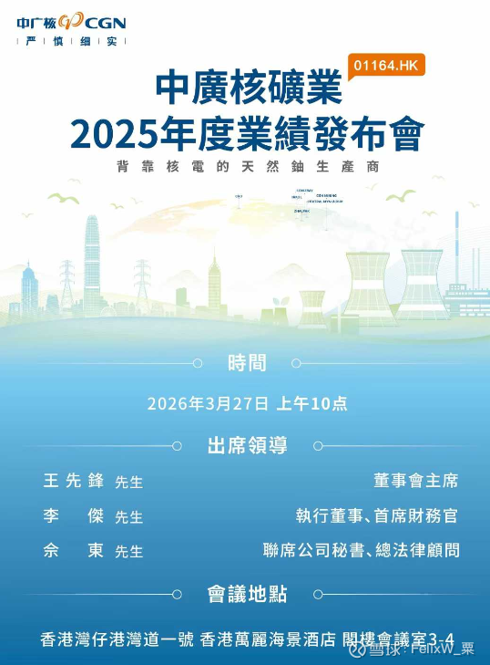 中广核矿业将于2026年3月27日下周五早上10点于香港湾仔香港万丽海景酒店阁楼会议室3~4召开2025年业绩发布会,开放式交流会,向所有人开放,无需注册,直接到场参加。