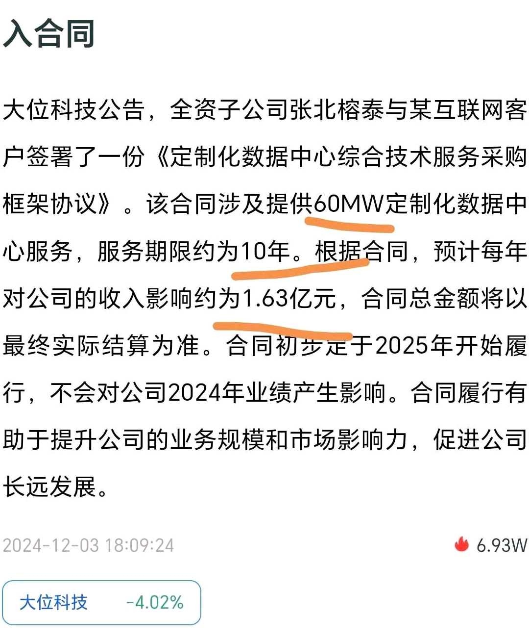 其中营业收入推测来自于大位的订单和润泽的订单,华著的AIDC收入会高于大位的IDC(大位的60mw就是5000p)