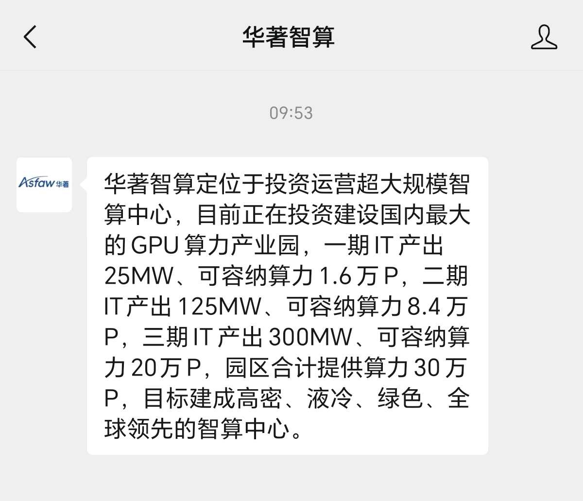 其中大位科技的张北数据中心只是个idc,并不是未来主流的aidc智算中心,从大位张北数据中心的用地规模,用电MW上能明显对比出来华著把最好的留给了自己,给大位的只是低端技术,用电规模都是130MW,可华著内蒙算力P数达到了惊人的10万p(大位张北的10倍),远超大位和其他同行,包括行业领军人物润泽科技的最新一代廊坊B的A11智算中心。华著内蒙用了最小的亩数建成了密度最高、用电最低、液冷的国家级智算中心。