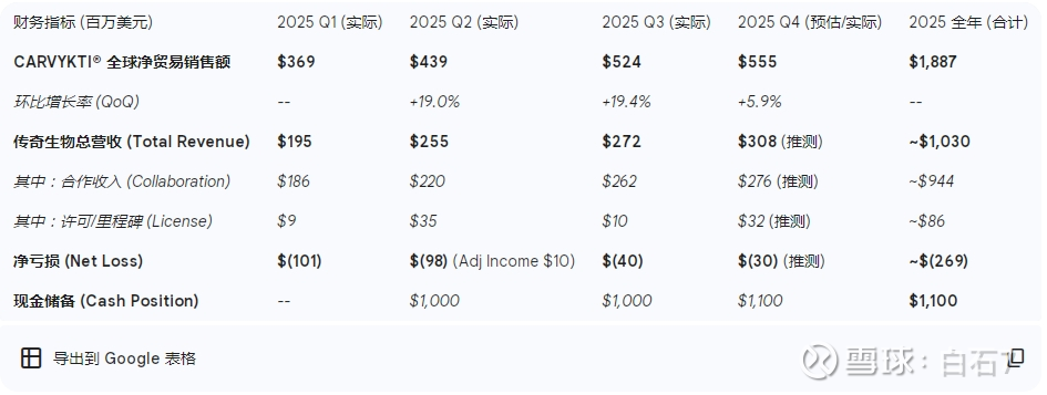 根据已披露的季度报告及业绩预告,传奇生物2025年全年的财务图谱如下: