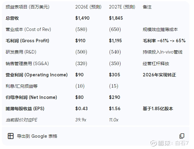 产能利用率: 考虑到生产爬坡的复杂性,假设2026年平均产能利用率为75%(即约7,500剂产量),2027年提升至85%。