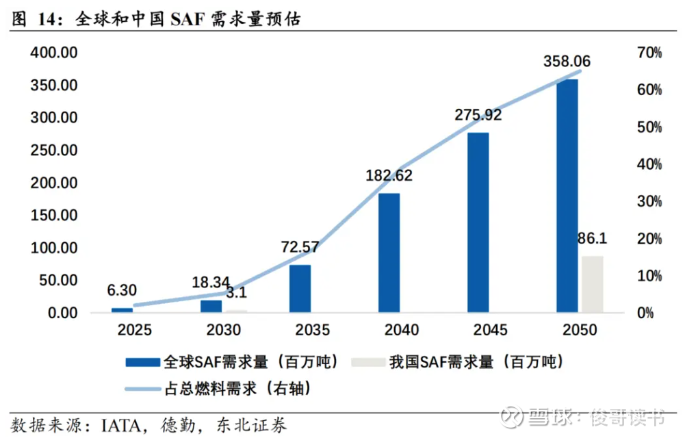 需求预测:到2030年,中国SAF需求预计达300万吨(占航空燃料总量约5.2%);到2050年,有望增至8610万吨,占全球总需求的24%左右。