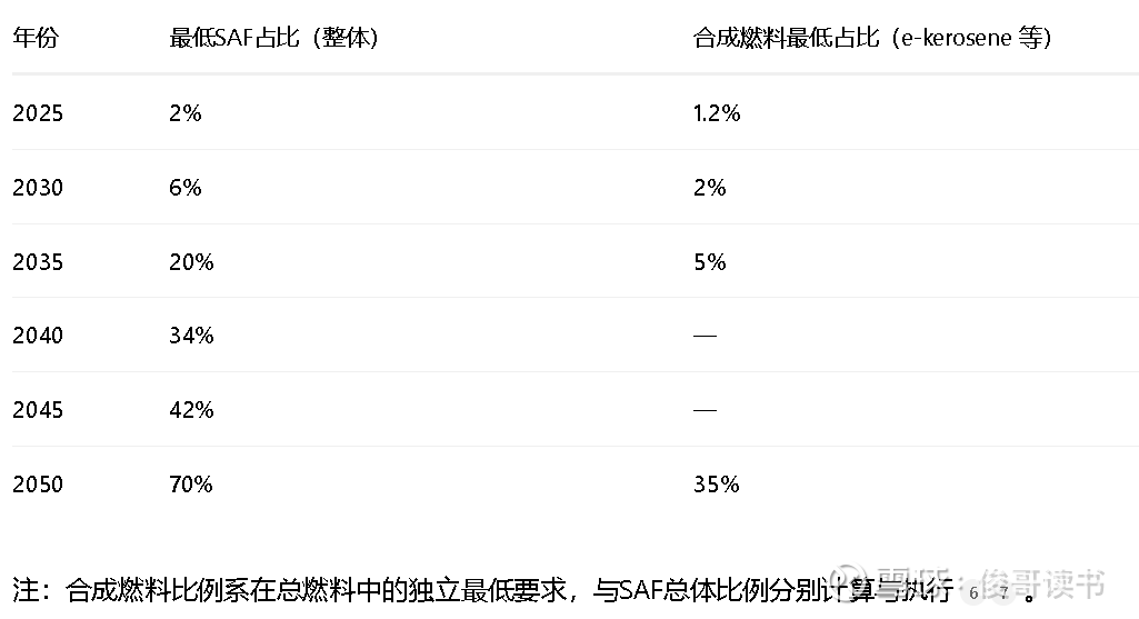 2050年目标:SAF掺混比例提升至70%,其中至少35%须来自“电转液”(PtL)等先进合成燃料。