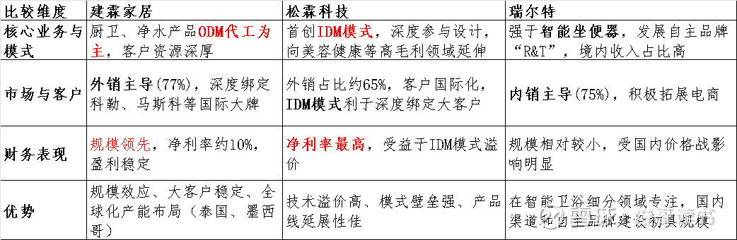 建霖家居的国内主要竞争公司分别是松霖科技、瑞尔特。它们同在厨卫代工赛道,但在具体领域、客户结构和市场策略上各有侧重。