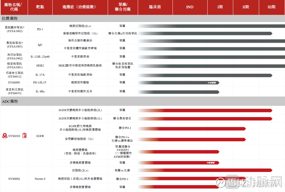 2025年4月美国癌症研究协会(AACR)年会公布了SYS6010用于晚期实体瘤患者的首次人体研究数据。在EGFR突变nsq-NSCLC 4.8mg/kg剂量组中,ORR和DCR分别为46.9%及93.9%。在EGFR野生型nsq-NSCLC 4.2、4.8及6.4mg/kg剂量组中ORR和DCR分别为71.4%及85.7%。