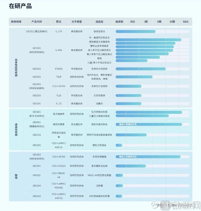 平台价值最终通过管线得以彰显。智翔金泰的研发并非追逐热门靶点的简单重复,而是致力于解决未满足的临床需求,并已催生出多个具有高度差异化的候选药物:例如,在研产品中,GR1603为国内首款进入临床试验阶段的抗IFNAR1单抗;GR1901为国内首款获批临床的抗CD123×CD3双抗;GR2002为全球首个获批临床的TSLP双表位双抗。