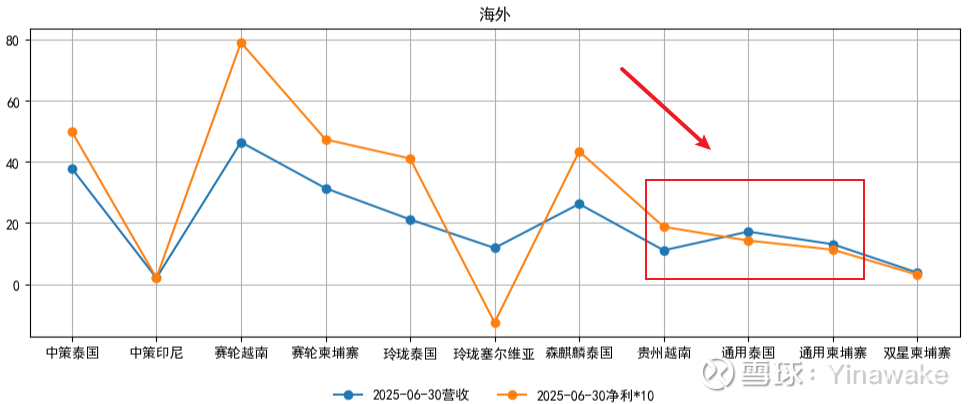 我们将利润X10然后结合营收看一下,看一下贵州轮胎越南和通用泰国的对比图,贵州轮胎的营收是小于通用股份的,但是其利润却比通用股份高,这是为什么,海外基地大家并不一样?